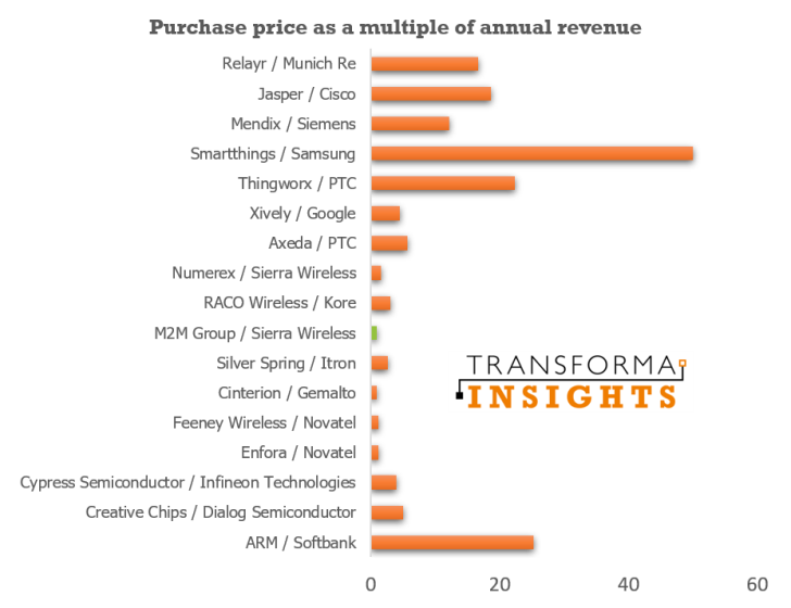 上图是物联网领域典型并购中,收购价格对应每年销售额的价值乘数。图中显示的一个明显趋势是,硬件公司在并购过程中的价值乘数明显低于软件公司。