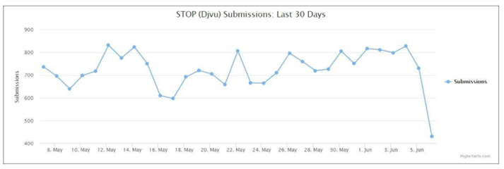 STOP勒索软件每天有600多个ID勒索软件识别服务提交,STOP勒索软件是过去一年中分布最活跃的勒索软件。