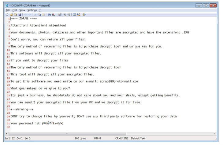 勒索软件还将在每个文件加密文件夹中创建名为“ --DECRYPT--ZORAB.txt.ZRB”的勒索笔记。本说明包含有关如何联系勒索软件运营商以获取付款说明的解释。