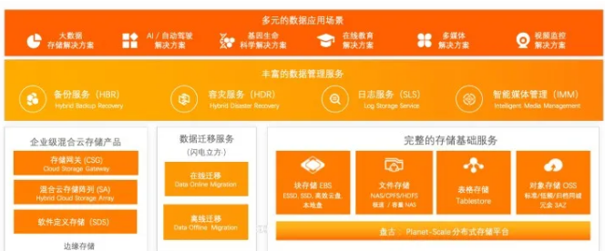 最后,包罗万象。阿里云存储具有完善的公共云、混合云产品体系以及多场景的解决方案生态,用户无论是需要全栈上云还是部分上云,都可以进行匹配。同时,在具体产品线上,拥有包括块存储、对象存储、文件存储、表格存储以及企业级混合云存储等多元化的产品形态,可以满足客户迁移、备份、容灾、日志服务等数据管理的实际需求。