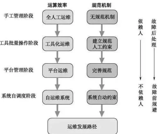 在整个运维的发展过程中,希望所有的工作都自动化起来,减少人的重复工作,降低知识传递的成本,使我们的运维交付更高效、更安全,使产品运行更稳定。对于故障的处理,也希望由事后处理变成提前发现,由人工处理变成系统自动容灾。