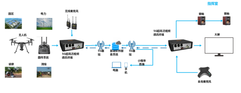 在运营商5G网络下,利用5G高速率、大带宽、毫秒级时延的特点,实现实时音频、4K视频的采集和广域无线传输。结合高清大屏作为后台管理设备对所有的移动终端进行统一的管理和控制。