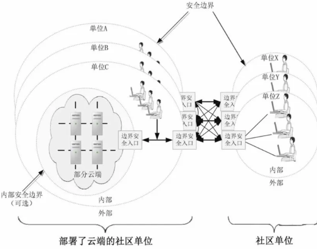 与私有云类似,社区云的云端也有两种部署方法,即本地部署和托管部署。由于存在多个单位组织,所以本地部署存在三种情况: