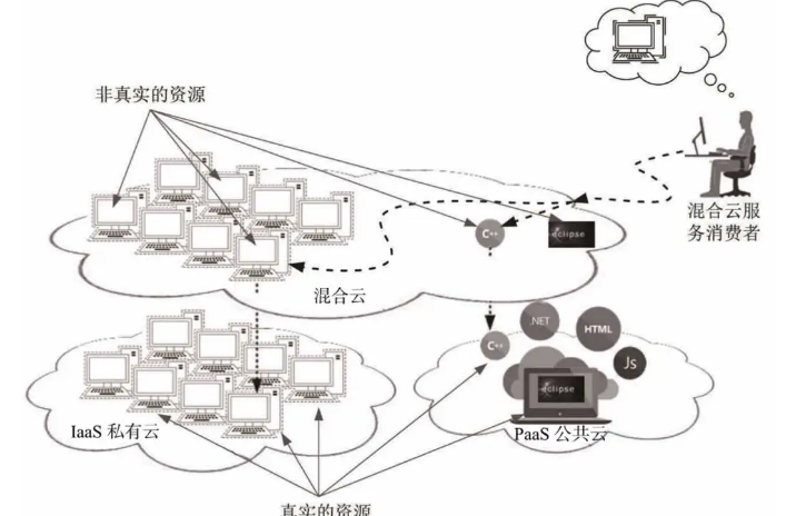 在图5中,假如用户在混合云上租赁了一台虚拟机(IaaS型资源)及开发工具(PaaS型资源),那么用户每次都是连接混合云端,并使用其中的资源。用户并不知道自己的虚拟机实际上位于另一个IaaS私有云端,而开发工具又在另一个公共云上。
