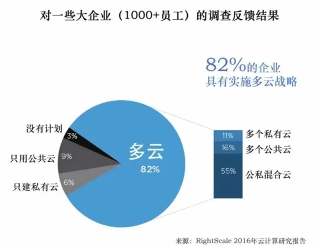 混合云属于多云这个大类,是多云大类中最主要的形式,而公/私混合云又是混合云中最主要的形式,因为它同时具备了公共云的资源规模和私有云的安全特征。从图7中可以看出(https://www.rightscale.com/),私有云和公共云构成的混合云占比达到55%。下面将围绕这种形式的混合云来展开阐述。