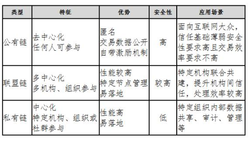 区块链技术有公有链、联盟链和私有链三种不同的应用模式,公有链是指任何人都可以随时参与网络中读取数据、发起交易和参与记账的区块链;联盟链是指若干个机构或组织共同参与管理记账的区块链;私有链是指所有参与节点严格控制在特定的机构、组织或社群团体的区块链。