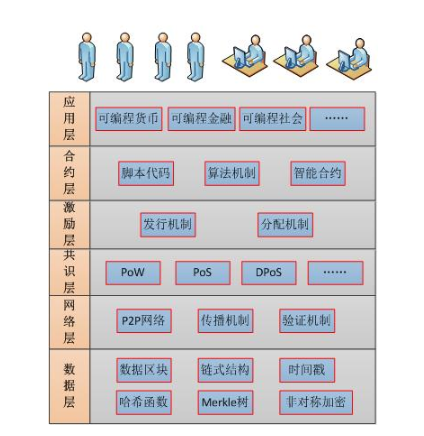 一般来说,区块链是由数据层、网络层、共识层、激励层、合约层、应用层6层结构组成,数据层主要对信息数据的记录、存储,封装了通过时间戳记录的数据区块、链式结构、哈希函数、Merkle树和非对称加密,网络层封装了P2P网络、传播机制和验证机制,共识层封装了网络节点的共识算法机制,目前共识算法主要有PoW、PoS、DPoS等等,激励层主要对于经济因素集成到区块链体系,一般为经济激励的的发行机制和分配机制,合约层主要封装了区块链的各类可编程脚本、算法机制和智能合约,应用层是对区块链的应用场景扩展。