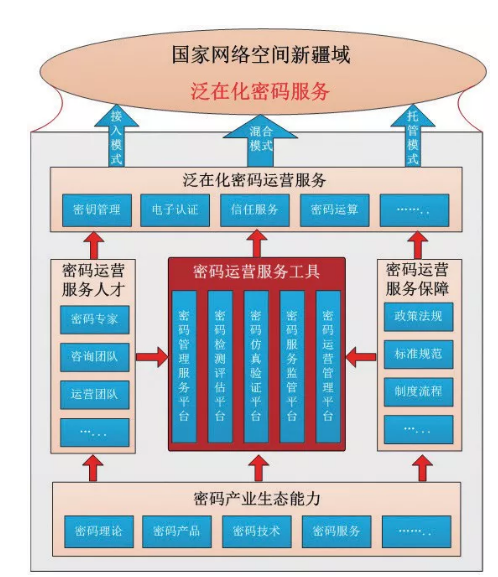 以密码产业生态能力为基础,以密码运营服务工具为主体,以密码运营服务人才和密码运营服务保障为支撑,打造密码运营服务体系,为国家网络空间新疆域提供接入、混合、托管等模式的泛在化密码运营服务。如图2所示。