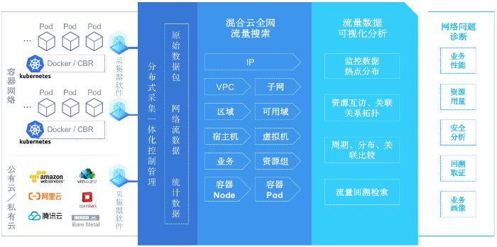 在生产环境中,获取混合云、云原生环境中的网络流、数据包并非易事,基于分布式架构,在可扩展网络监控框架下,流量采集与后端监控分析实现解耦,在采集侧需要支持物理网络、KVM、ESXi、容器等资源池网络环境,为全网流量采集方案提供基础捕获能力。