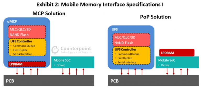 从包装的角度来看,MCP解决方案仅在中低端智能手机中占主导地位。高性能移动设备的系统设计人员更喜欢使用层叠封装(PoP)解决方案,该方案包括低功耗DRAM以及分立的UFS或eMMC。PoP解决方案可以提供比MCP解决方案更好的性能,因为应用处理器(AP)可以在高频下直接与低功耗DRAM通信,以减少AP和RAM通信信号的干扰。
