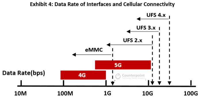 与5G的1-10 Gbps相比,4G LTE的理论传输速率可以超过1Gbps,但在大多数情况下,实际速度仍低于500Mbps。基于5G的XR,在线游戏和8K视频将需要6 Gbps的速度,因此UFS在这些应用中至关重要。