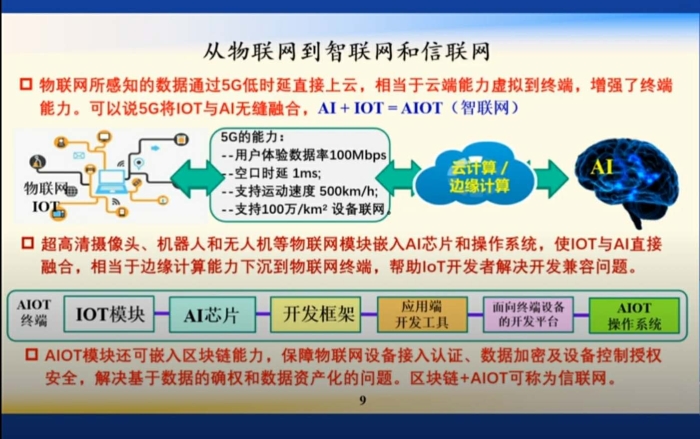 另外通过5G,可以打通物联网,并且上升到智联网以及信联网。传统的互联网是感知数据,通过网络收集数据,过去的网络带宽不够,延时比较长,达不到实时性分析效果。现在5G来了,延时短,且能够支持大连接、高速运动,使互联网和人工智能无缝连接。更进一步地,可以在超高清摄像头、机器人和无人机等物联网模块嵌入AI芯片和操作系统,使IOT与AI直接融合,相当于边缘计算能力下沉到物联网终端,帮助IoT开发者解决开发兼容问题。再进一步地,AIOT模块还可嵌入区块链能力,保障物联网设备接入认证、数据加密及设备控制授权安全,解决基于数据的确权和数据资产化的问题。区块链+AIOT可称为信联网。