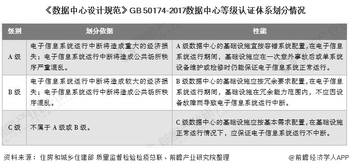 我国目前关于数据中心级别认证相关标准主要为《数据中心设计规范》GB 50174-2017。与Uptime Institute将数据中心基础设施可用性、可靠性及运维管理服务能力认证划分为四个级别不同,《数据中心设计规范》只认证了A、B、C三个级别,主要根据数据中心的使用性质、数据丢失或网络中断在经济或社会上造成的损失或影响程度确定所属级别。