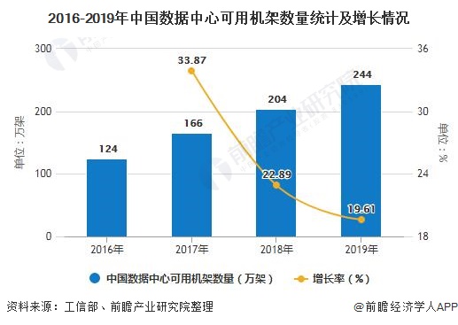 数据中心服务器机架主要用于容纳数据中心IT设备,如:服务器、存储器、HUB和网络交换机等,旨在提高数据中心网络管理和运营的效率。2016-2019年我国数据中心可用机架数量稳步增长。根据工信部数据,2019年我国数据中心可用机架数量为244万架,较2016年增长120万架,涨幅较大。作为数据中心重要组成部分和规模划分依据,机架数量的增长有助于我国数据中心整体建设以及规模以上数据中心占比的提升。