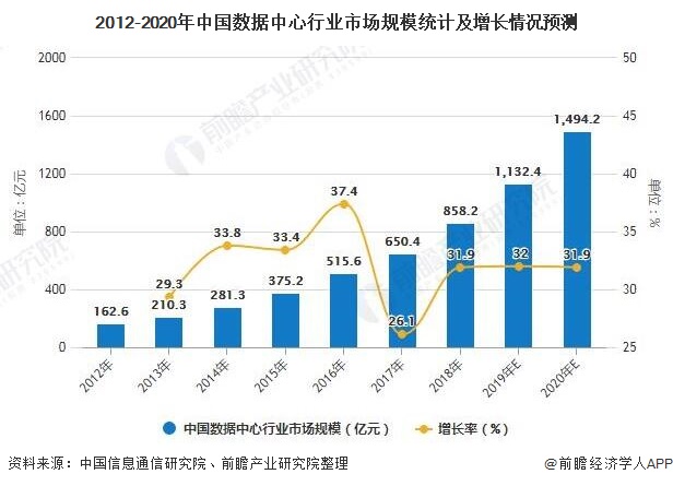 2012-2019年我国数据中心市场规模持续扩张,2019年我国数据中心市场规模估计已突破1000亿元,2020年预计接近1500亿元。增速方面,2012-2019年我国数据中心市场规模同比增速维持在30%左右,说明我国数据中心产业发展势头良好,规模增长较快。主要得益于我国现阶段互联网的迅速普及,数据产生与处理量激增,从而进一步刺激下游数据中心产业的市场需求。