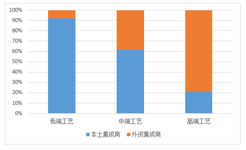 中国市场本土与外资系统集成商工艺类别占比情况(单位:%)
