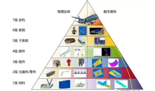 对象的分解可以有“横向”和“纵向”两个维度。根据著名智能制造专家赵敏老师的论述:“横向分解”是从生命周期的角度,把实体产品发展的过程划分成“需求分析”、“方案设计”、“加工制造”等若干个阶段,一直到最后的“维护管理”和“产品退役”为止。而“纵向分解”则是在任一时间点,将对象逐层分解为细小的模块。例如:飞机这样的大型复杂工业品也可以分为“系统”、“子系统”。。“元器件/零件”、“原材料”等各个层次,如图3所示。