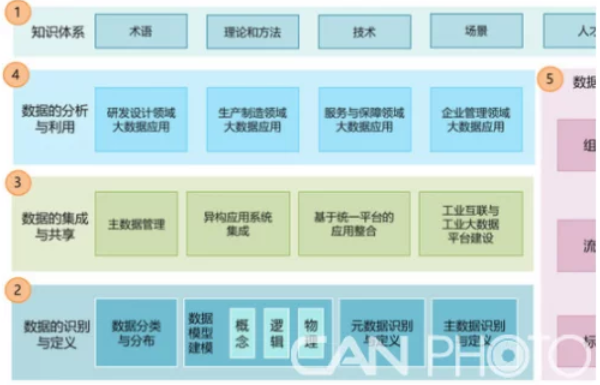 推进框架。工业大数据相关工作可以划分五类,包括:构建知识体、数据识别与定义、数据集成与共享、数据分析与利用、数据治理。构建知识体的目的是为了统一大数据认知,规范相关术语概念,建立统一语言。数据识别与定义的目的是为了摸清数据资产状况,并规范数据。数据集成与共享的目的是打通信息通道,让数据流动起来。数据分析与利用的目的为了让数据产生价值。数据治理的核心目的是为了保障数据安全、数据质量。