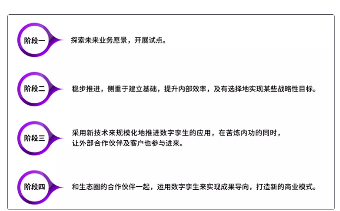 埃森哲《数字孪生:打造生力产品,重塑客户体验》白皮书提出了推进数字孪生应用的四个阶段。