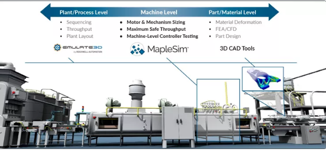 Maplesoft公司的MapleSim平台提供了一体化的生产线虚拟调试解决方案。2019年,罗克韦尔自动化公司并购了Emulate3D软件,作为罗克韦尔Factorytalk/DesignSuite软件的一部分,可以实现对整个工厂自动化控制系统进行虚拟仿真和虚拟调试,还可以利用工厂的数字孪生模型对员工进行培训,降低工厂运营的风险。