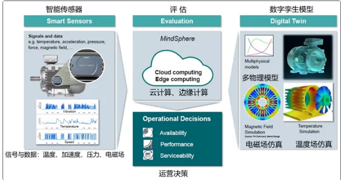 西门子将来自智能传感器的温度、加速度、压力和电磁场等信号和数据,以及来自数字孪生模型中的多物理场模型和电磁场仿真和温度场仿真结果传递到Mindsphere平台,通过进行对比和评估,来判断产品的可用性、运行绩效和是否需要更换备件。