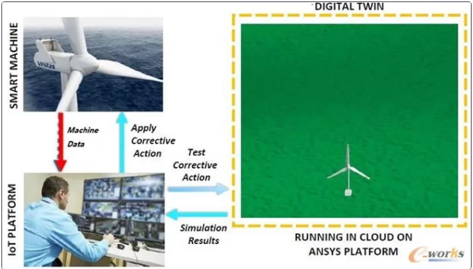 对于能够实现智能互联的复杂产品,尤其是高端智能装备,将实时采集的装备运行过程中的传感器数据传递到其数字孪生模型进行仿真分析,可以对装备的健康状态和故障征兆进行诊断,并进行故障预测;如果产品运行的工况发生改变,对于拟采取的调整措施,可以先对其数字孪生模型在仿真云平台上进行虚拟验证,如果没有问题,再对实际产品的运行参数进行调整。下图是ANSYS的数字孪生技术在风电行业应用的案例。通过应用数字孪生技术,可以帮助风电企业避免非计划性停机,实现预测性维护和运行控制与优化。