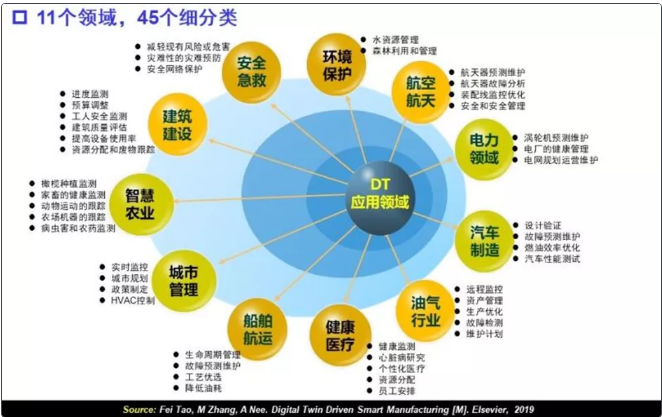 数字孪生技术在各个行业有广泛的应用场景。陶飞教授团队在《计算机集成制造系统》2018年第1期刊登的“数字孪生及其应用探索”一文中,归纳了14种应用场景,后来又在论文中介绍了数字孪生在航空航天、电力、汽车、石油天然气、健康医疗、船舶航运、城市管理、智慧农业、建筑建设、安全急救、环境保护等11个领域,45个细分类的应用。