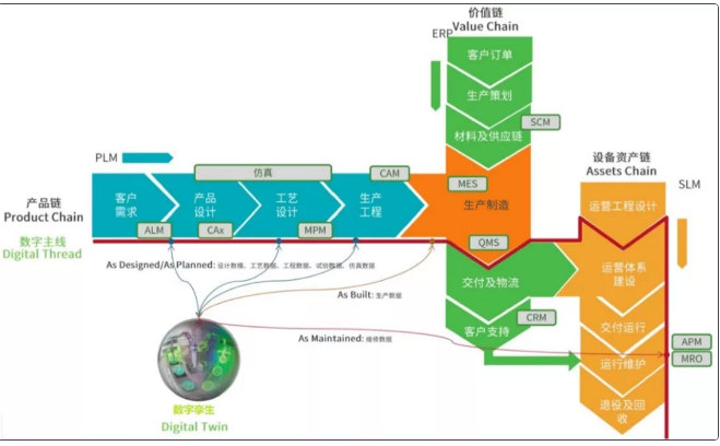 对产品数字孪生模型的仿真分析,可以发现产品出现了什么问题。但如果要探究为什么出现问题,还需要依靠数字主线把各个阶段的数字孪生模型串起,来进行整合分析。