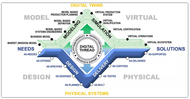 CIMdata认为,数字主线是一种信息交互的框架,能够打通原来多个竖井式的业务视角,连通设备生命周期数据(也就是其数字孪生模型)的互联数据流和集成视图。数字主线通过强大的端到端的互联系统模型和基于模型的系统工程(MBSE)流程来支撑和支持。波音公司开展了数字孪生和数字主线应用实践,提出基于模型企业(MBE)“钻石模型”。
