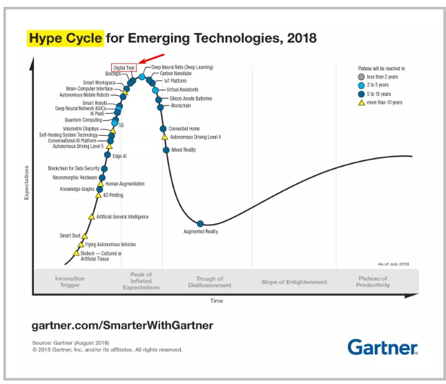 从2018年Gartner发布的新兴技术成熟度曲线中可以看出,数字孪生已经进入了过热期,其建设和预期出现了高峰,超出其当前能力,会形成投资泡沫。
