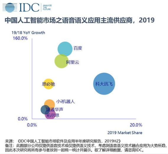 相比机器视觉市场,智能语音市场则由科大讯飞、百度、阿里等科技巨头占主导。与此同时,思必驰、小i机器人、捷通华声等优秀人工智能创新企业也跻身中国人工智能语音应用主流玩家。