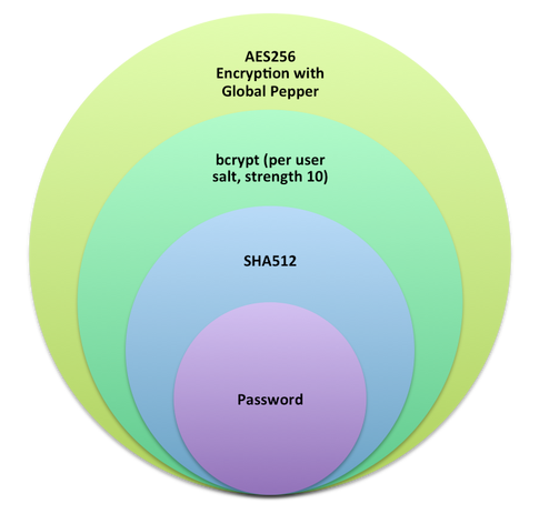 如上图所示,Dropbox首先对用户密码做了一次sha512哈希将密码转化为64个字节,然后对sha512的结果使用Bcrypt算法(每个用户独立的盐、强度为10)计算,最后使用AES算法和全局唯一的密钥将Bcrypt算法的计算结果加密并保存。