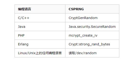 CSPRNG跟普通的随机数生成算法,比如C语言标准库里面的rand()方法,有很大不同。正如它的名字所揭示,CSPRNG是加密安全的,这意味着用它产生的随机数更加随机,且不可预测。常见编程语言都提供了CSPRNG,如下表: