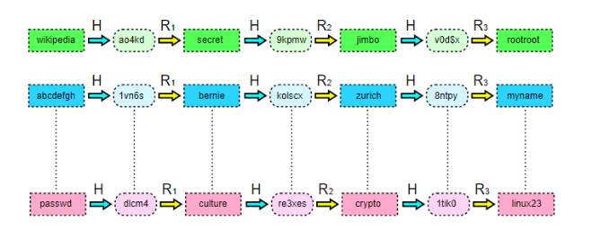 在这个例子里面,空间不够,那就多花一些时间。在彩虹表中,可以将全部的sha256值转化为长度相同的若干条hash链,只保存hash链的头和尾,在破解的时候先查询得到sha256存在于哪条hash链中,然后计算这一条hash链上的所有sha256,通过实时比对来破解用户密码。