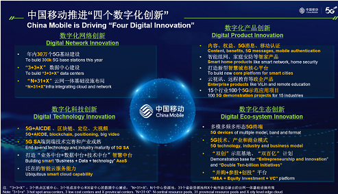 四是数字化生态创新。大力推进5G共建共享,推动多模多频多形态5G终端发展成熟,联合垂直行业合作伙伴,加快推动5G技术、产业和商业模式迭代成熟,持续推进“双创”示范基地建设和“双百亿”生态引入与合作分享计划落地,构建“并购+参股+创投”投资平台,打造资源共享、融通发展的创新生态。