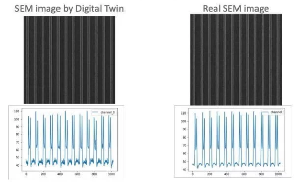上图由SEM数字孪生生成的掩模SEM图像和真实SEM图像的两个示例。还显示了在同一位置的水平切割线上的图像强度。不仅图像看起来非常相似,而且边缘的信号响应也相似。
