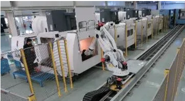 (4)柔性生产线。在航空零部件行业,6台机床通过机器人+轨道形成柔性生产线(见图5),实现不同型号飞机部件的自动化切换和加工,提升了设备总体稼动率,缩短了交付周期,降低了库存并且减少了人工。