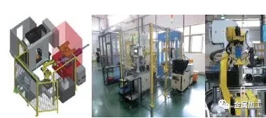 (3)自动化单元。在汽车零部件行业,机器人和三台加工设备形成自动化单元(见图4),实现冲压工序、机加工序及去毛刺工序集成的无人化一件流作业单元,达到了节省人工、7×24h运营及提高生产率的效果。