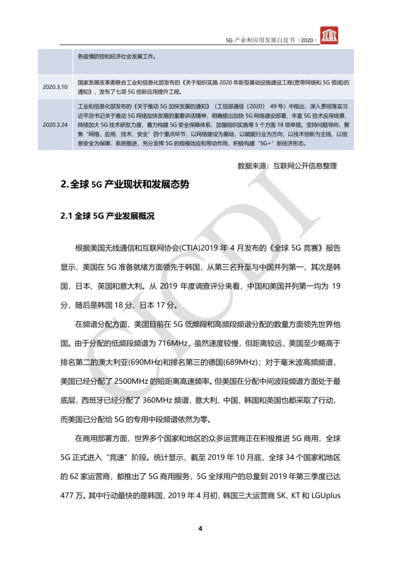 根据美国无线通信和互联网协会(CTIA)2019 年 4 月发布的《全球 5G 竞赛》报告显示,美国在5G准备就绪方面领先于韩国,从第三名升至与中国并列第一,其次是韩国,日本、英国和意大利。