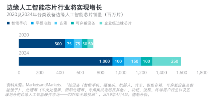德勤预测,至2024年,边缘人工智能芯片(执行或加速设备内,而非远程数据中心机器学习任务的芯片或芯片部件)销量预计将超过15亿片,甚至可能远远超过这一数据,年销量增长率将达到20%,是半导体行业整体长期预测的9%复合年均增长率的两倍以上。而这些边缘AI芯片很大可能将流向日益增多的消费级设备,如高端智能手机、平板电脑、智能音箱及可穿戴设备等,同时也将应用于多个企业市场——机器人、摄像头、传感器及其他物联网设备。
