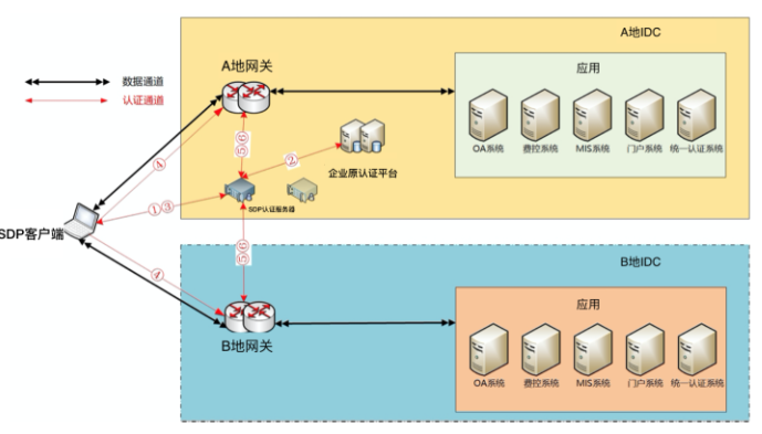 下图为SDP架构在客户环境中部署的架构图。认证通道和数据通道被有效的隔离,通过一台客户端即可访问不同网段应用,实现了客户的需求。