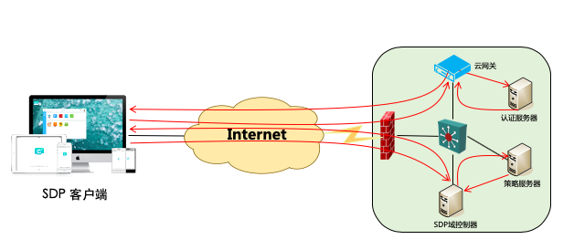 在SDP中,传统的企业边界被打破,防火墙不再是企业唯一的边界,内网也通过逻辑进行划分;同样,公有云和私有云之间也需要建立新的边界。SDP适应软件定义网络架构,为云而生,尤其适应混合组网环境,与SD-WAN(软件定义广域网)结合,为企业组网赋予更深一层的安全防护能力。