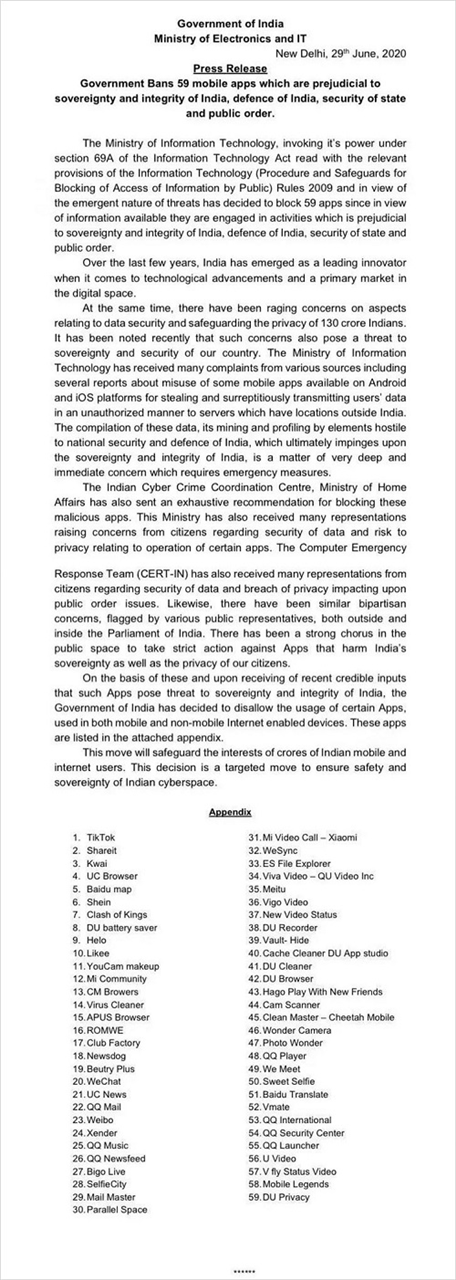 出于国家主权和网络安全的考虑,印度电子和信息技术部宣布禁用59款中国App。
