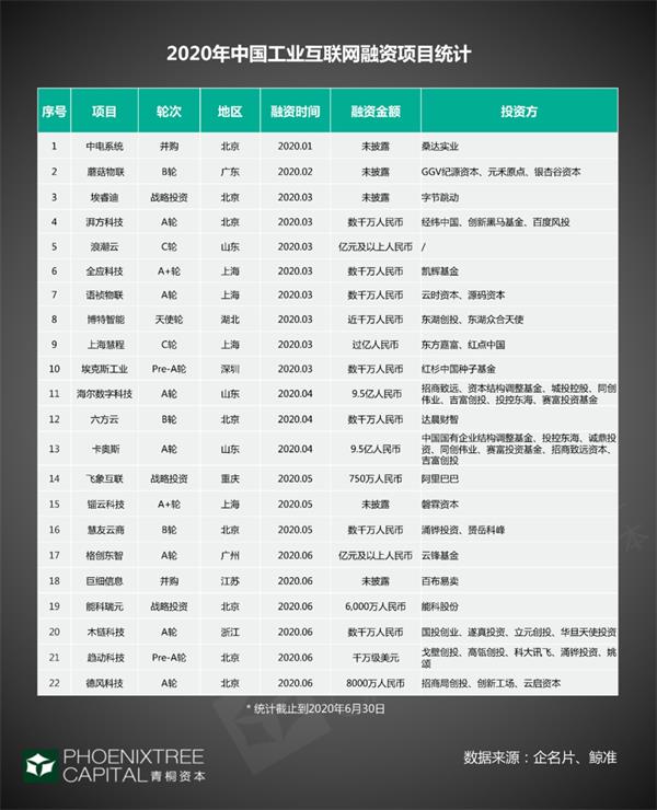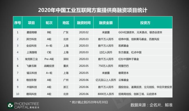 2020年1-6月,工业互联网共发生22起融资,46家投资机构入场。其中,A/A+轮共9起,B轮3起。工业互联网赛道,未受疫情影响,创投活跃。