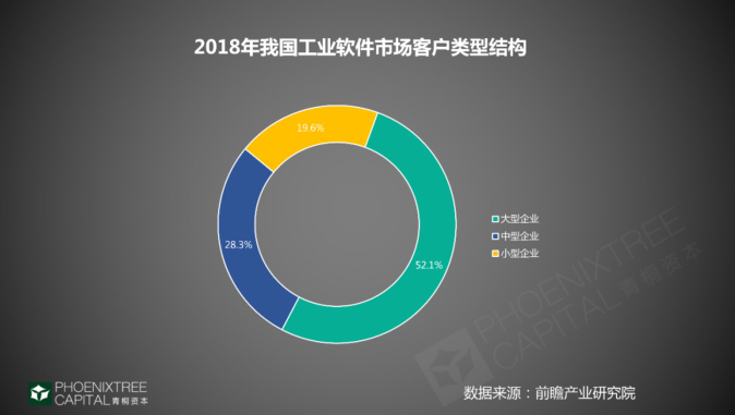 另外,国产替代是中国工业软件发展的必然趋势。青桐资本统计发现,大型企业采购工业软件的预算在500-800万,中型企业为70-300万,小型企业为20-30万。国产替代在中小型客户中有价格优势。另据前瞻产业研究院数据,2018年我国工业软件市场客户中,中小型客户占据47.9%。