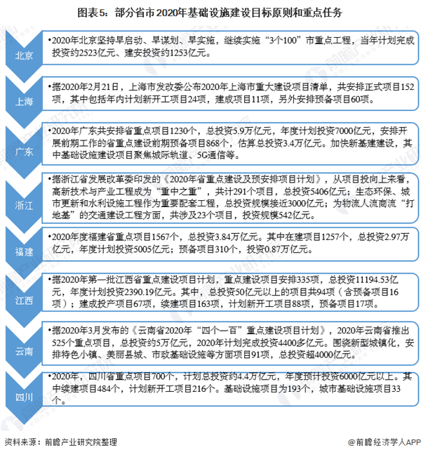 2020年各省市颁布了基础设施建设目标原则和重点任务,其中北京坚持早启动、早谋划、早实施,继续实施“3个100”市重点工程,当年计划完成投资约2523亿元、建安投资约1253亿元;上海市共安排正式项目152项,其中包括年内计划新开工项目24项,建成项目11项,另外安排预备项目60项。