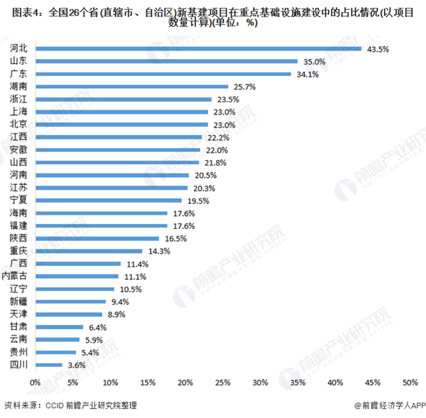河北、山东、广东的新型基础设施数量占比较高,分别达到了43.5%、35.0%及34.1%