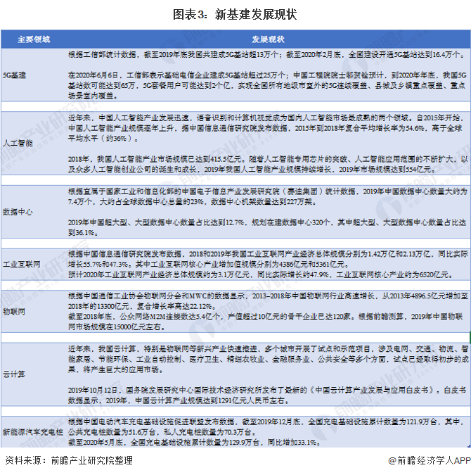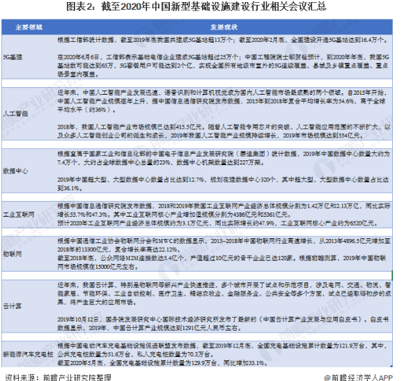 2018年年底的中央经济工作会议提出“加快5G商用步伐,加强人工智能、工业互联网、物联网等新型基础设施建设”,新基建的概念由此产生,并被列入2019年政府工作报告;2019年两会期间提出除了传统基建外,新型基建将承担更为重要的角色;2019年7月中央政治局会议提出要加快推进新型基础设施建设;2020是全面建成小康社会和“十三五”规划收官之年,原本处于经济结构转型和贸易战压力下的中国经济又遭受新型冠状病毒疫情的冲击,新基建作为重要的逆周期调节手段,在多次会议中被频繁提及。