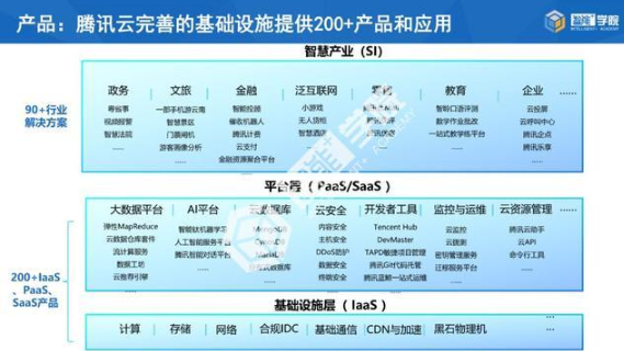 分领域看,不同玩家在边缘层、平台层、应用层也各有布局。其中,阿里巴巴、腾讯、华为等科技巨头试图对平台层和应用层实现全面渗透。以腾讯为例,其提供计算、存储等基础设施层服务,也提供大数据平台、AI平台、云数据库等平台层服务,同时还输出行业解决方案。