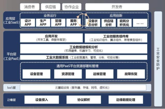 这四个方面分别对应边缘层、IaaS层、工业PaaS层、工业SaaS层以及贯穿上述各层级的安全防护,而其中,边缘层、平台层、应用层是工业互联网平台的三大核心层级。